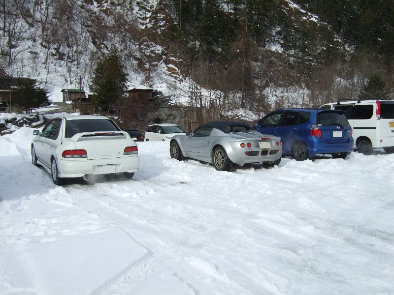 RAV4がどいたところで、同じ坂にいちご10号氏がチャレンジするも、呆気無く敗退。路面が片側はウェット・片側は溶けかけの雪というスプリットに成っている為、LSDの装着されていないクルマでは、雪に乗った方のタイヤが滑りだすと一気にホイールスピンが始まってトラクションがかからなくなってしまうようだ。エリーゼとフィットの2台は、ここでついにAutosockを装着する。